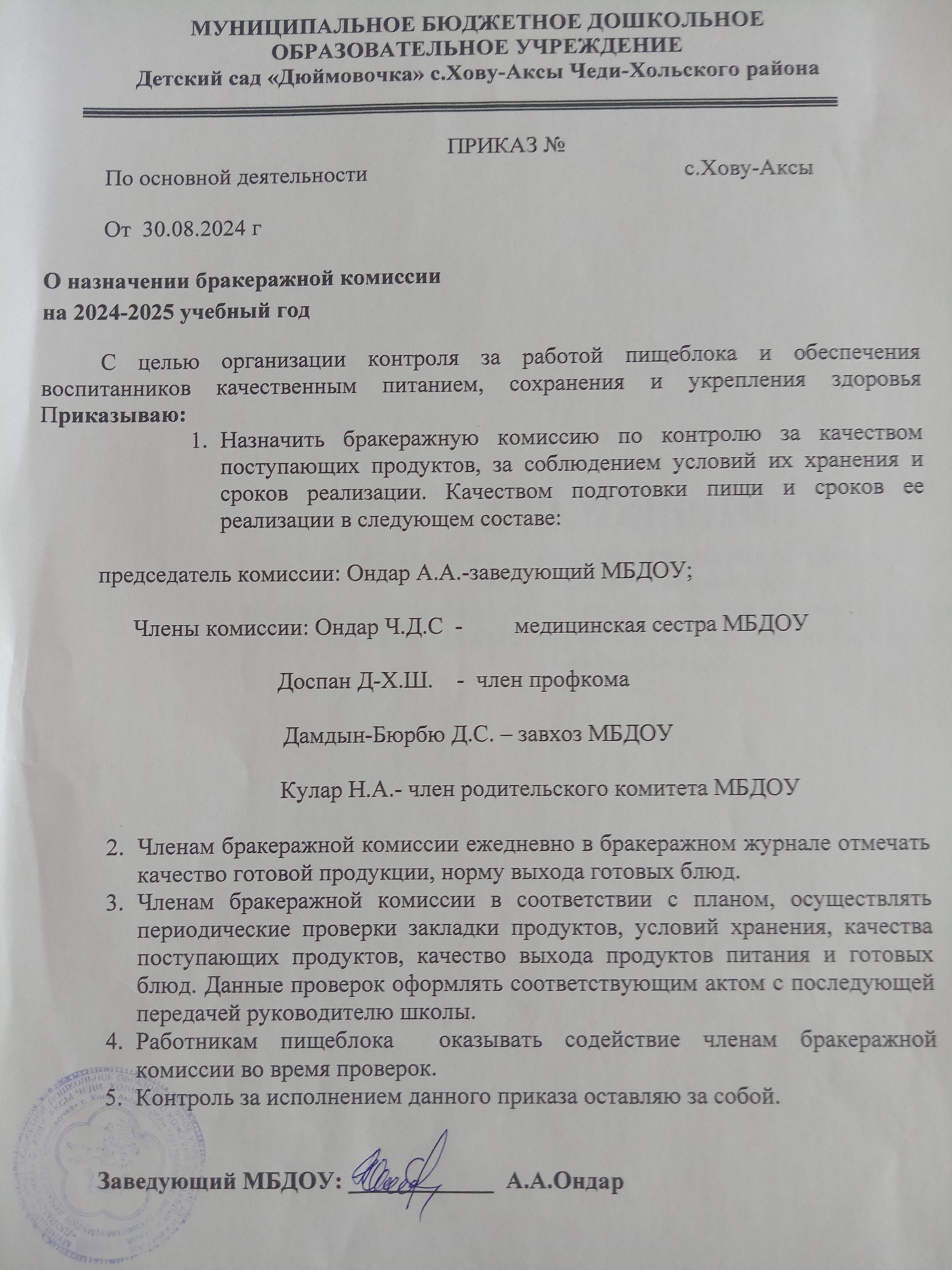 Положение о комиссии по контролю за организацией и качеством питания бракеражу готовой продукции МБДОУ детского сада «Дюймовочка» с.Хову-Аксы Чеди-Хольского районаСкачать