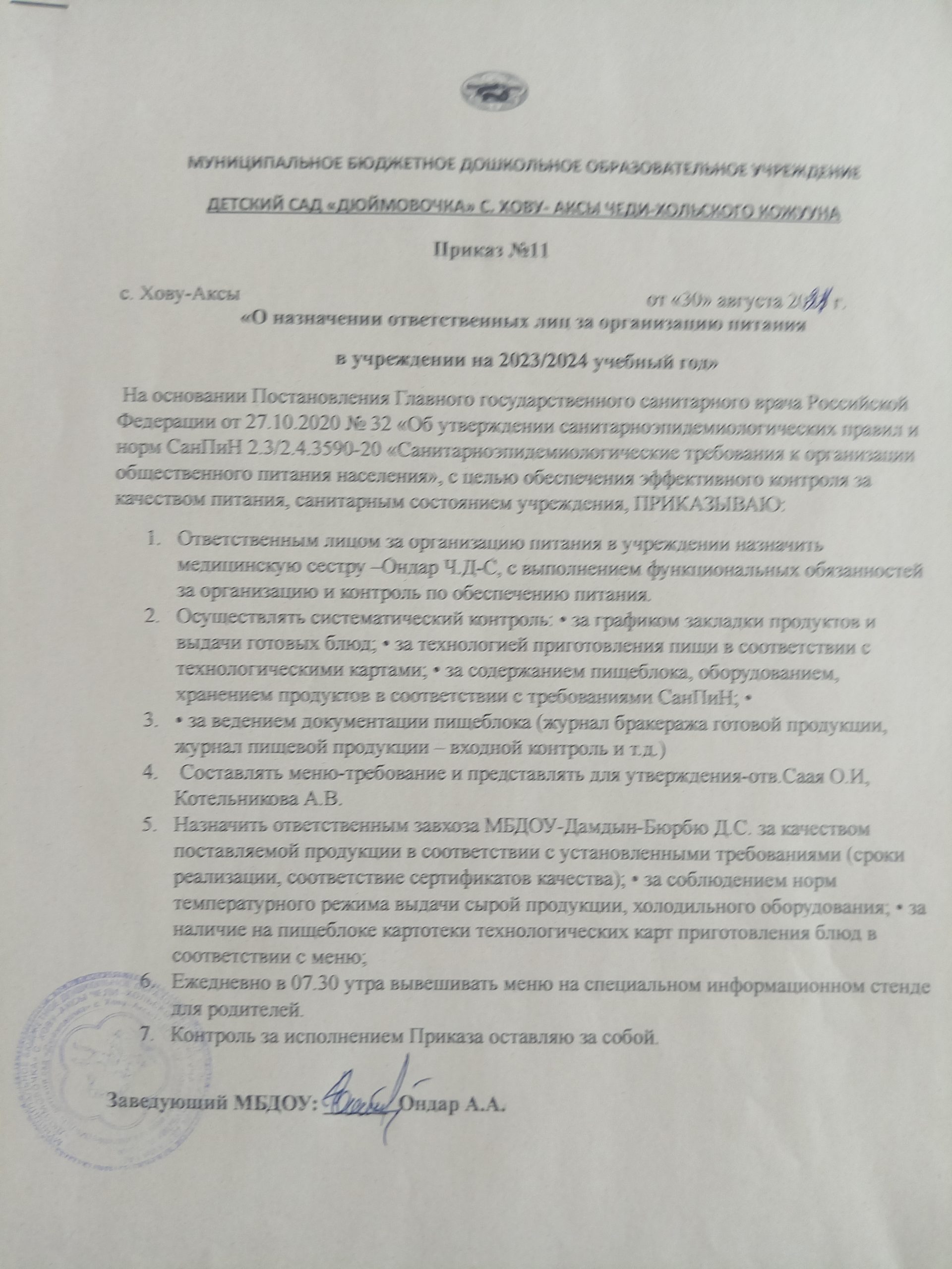 Положение- об организации питания в МБДОУ детского сада «Дюймовочка» с.Хову-Аксы Чеди-Хольского района РТСкачать